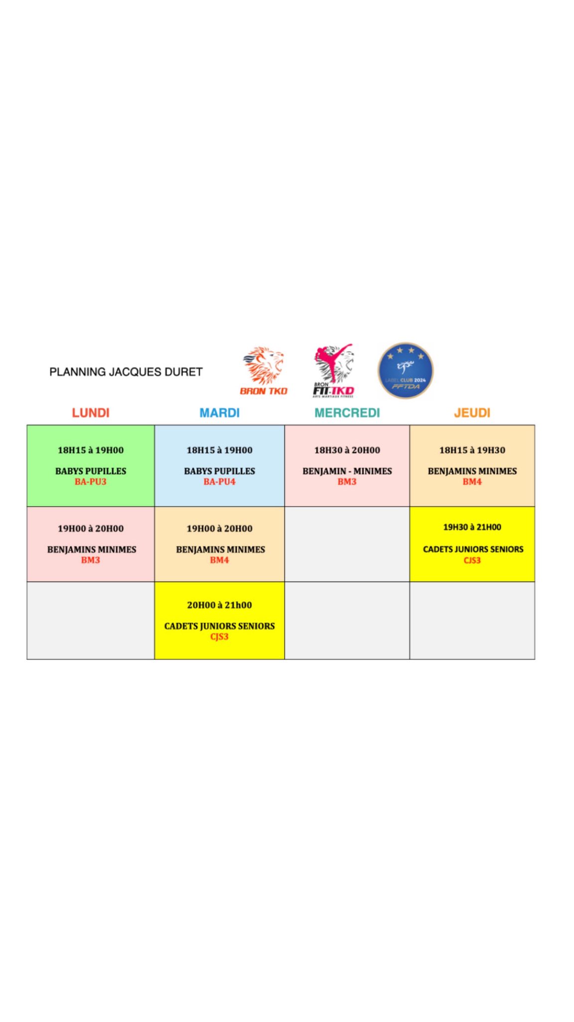 Le club s'entraîne dans deux salles principales à Bron. Retrouvez ci-dessous les créneaux par catégorie d'âge et par niveau.